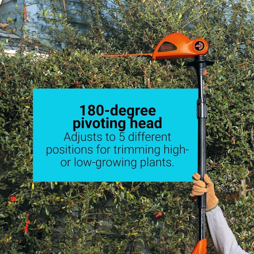 - The 180-degree pivoting head adjusts to five different positions making it easy to cut high- and low-growing plants.